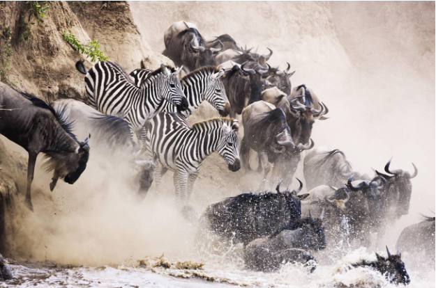 Few wildlife events compare to the scale of the Great Migration in the Masai Mara National Reserve. Millions of wildebeest and zebra move across the plain in search of fresh grazing. River crossing bring dramatic scene as predators wait nearby.